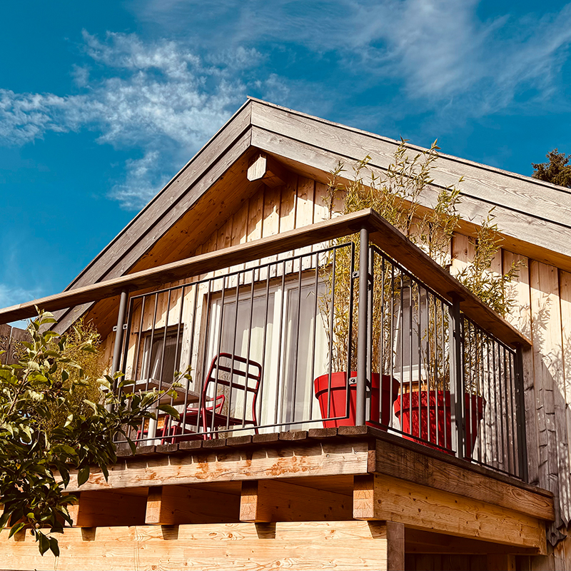 Liebevoll in Massivholzbauweise und aus hochwertigen Materialien erbautes kleines Häuschen mit Ferienwohnung im ersten Stockwerk.